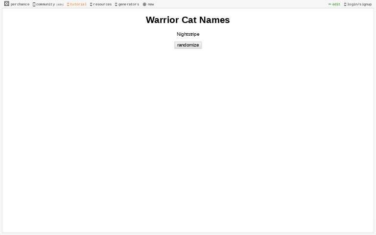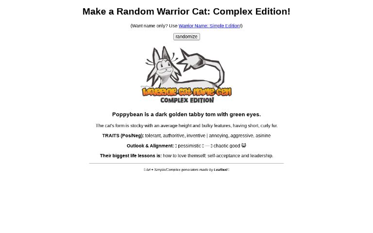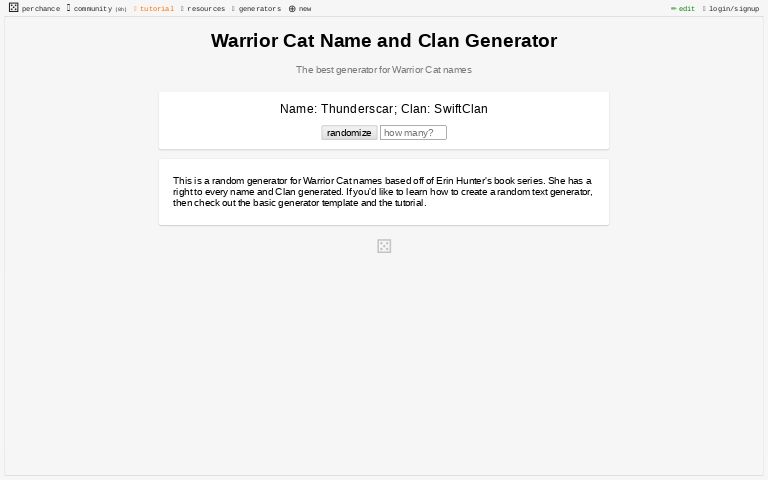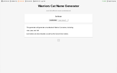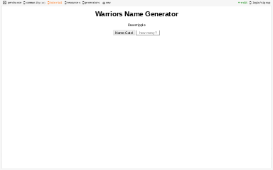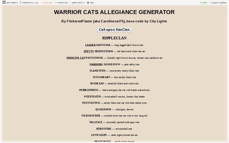 I have made a lot of oc over the years and i have put some of my fav oc that i made into the quiz it's time to see which one your are like most i wanted to add more but i was getting tired of having to write so much lol. I hope you will be satisfied with using it. If you need help with errors, please post a question to the perchance.warrior cats name generator. This warrior cat name generator will suggest thousands of cats name. Do you ever wonder what would you be called if you were one among the clan of warrior cats?