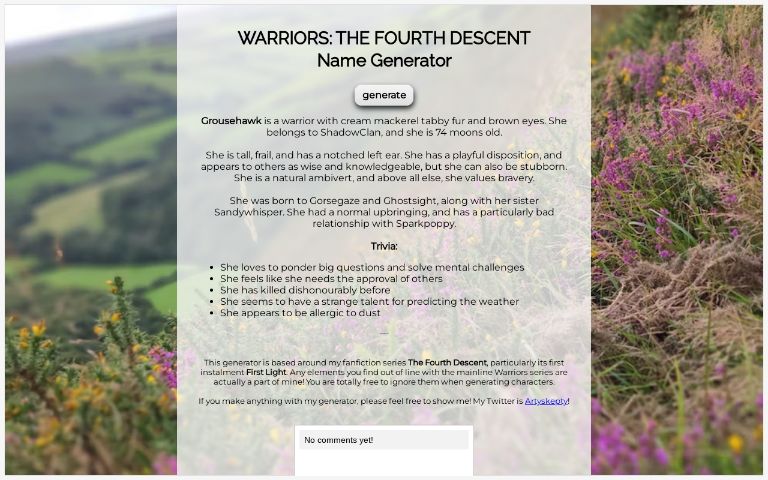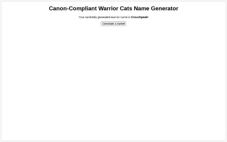 Warrior Cats Name Generator Perchance - maxie's warrior cat generator ― Perchance / They have red fur and stripes, they have a few scars.. Do you ever wonder what would you be called if you were one among the clan of warrior cats? And a warrior cat name generator that produces thousands of options. I update it almost monthly with new additions. It will help you to generate 1000's of cool warrior cat names which you can use in books, novels, games, or whatever fantasy world you want to use it. Discover warrior cat names with this warrior cat name generator.